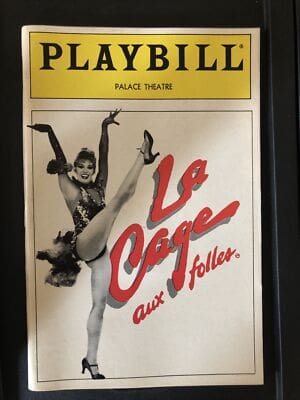 The original cast of La Cage on Broadway & the original playbill for the show. La Cage opened in the Palace Theater in 1983. The play has since been adapted to movies and is a classic production for theater performances around the globe.