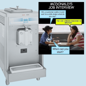 For years, McDonalds banned owners from calling in anyone but Taylor, the company that makes the machiines, to make sense of all the senseless lights and codes that pop up when something goes wrong – the stuff that takes the shake machines down. The problem is (of course) customers get upset and drive-thru employees get yelled at. It’s been happening for years.