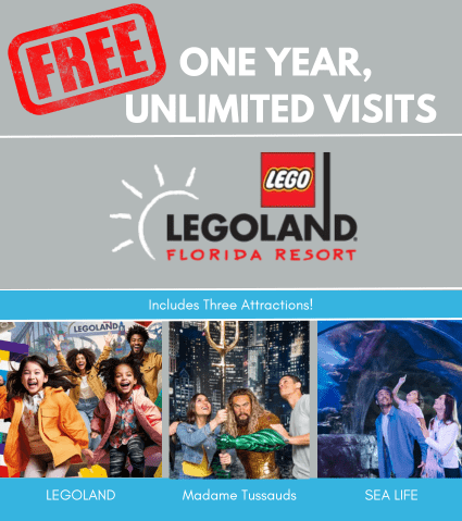 Over at LEGOLAND, you not only get in free for a year, but you can go to three LEGOLAND-owned attractions with the same pass. That’s right. Three hot vacation spots. One pass. ALL free for an entire year!